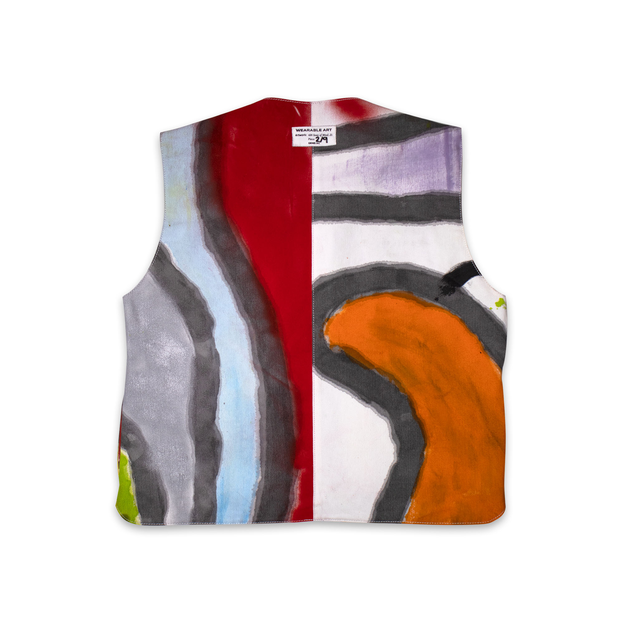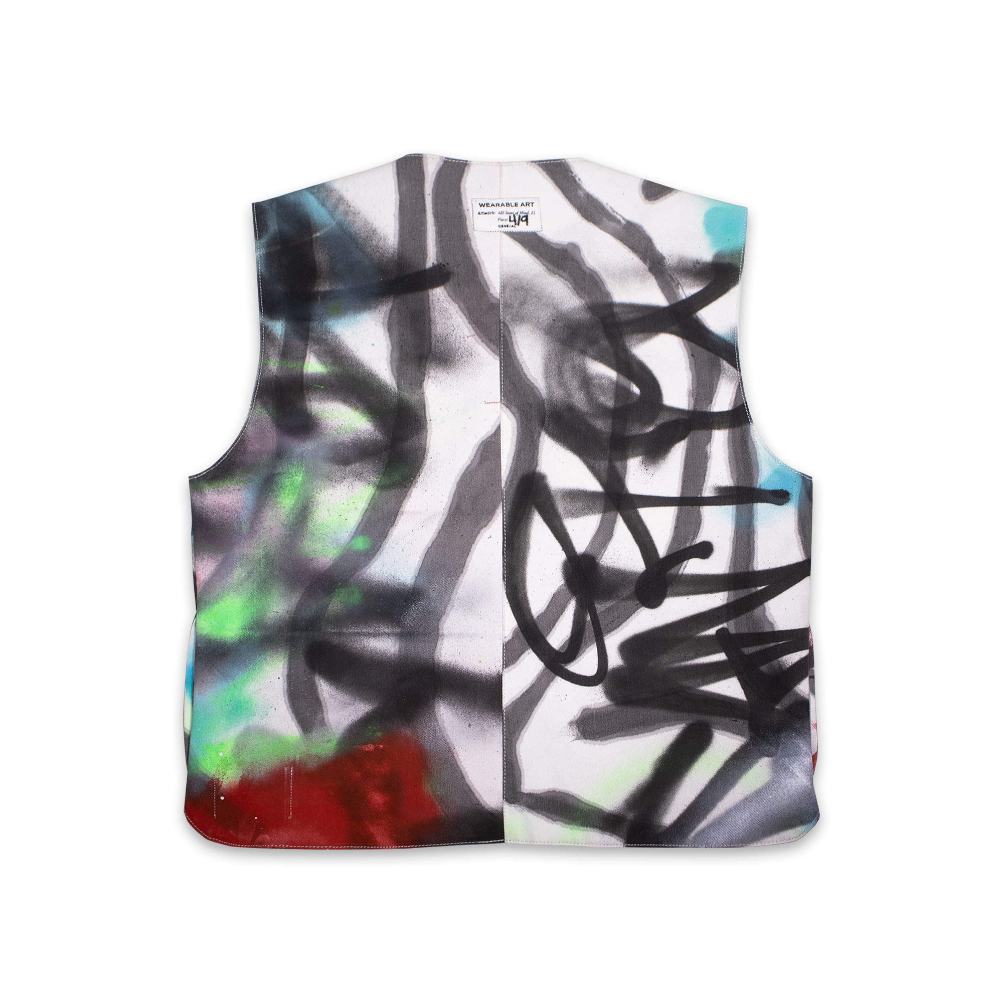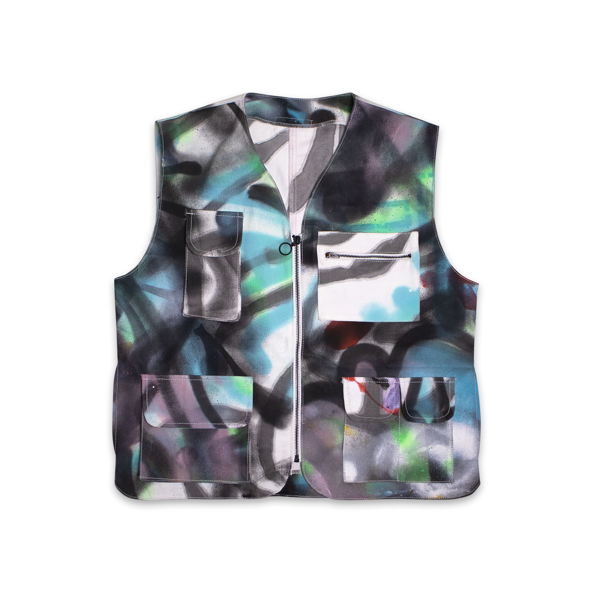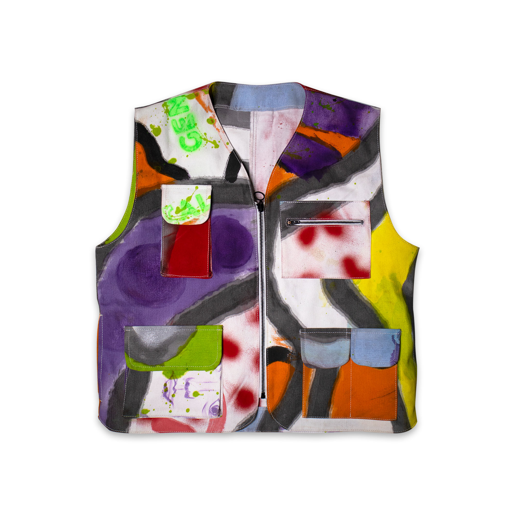 Esta edición limitada de chalecos, intervenida individualmente por Nebulosa, propone una mirada introspectiva sobre una prenda poco convencional: el chaleco. Cada pieza fue transformada en una obra única, funcional por sus múltiples bolsillos y detalles pensados para resguardar lo que su portador lleva consigo.