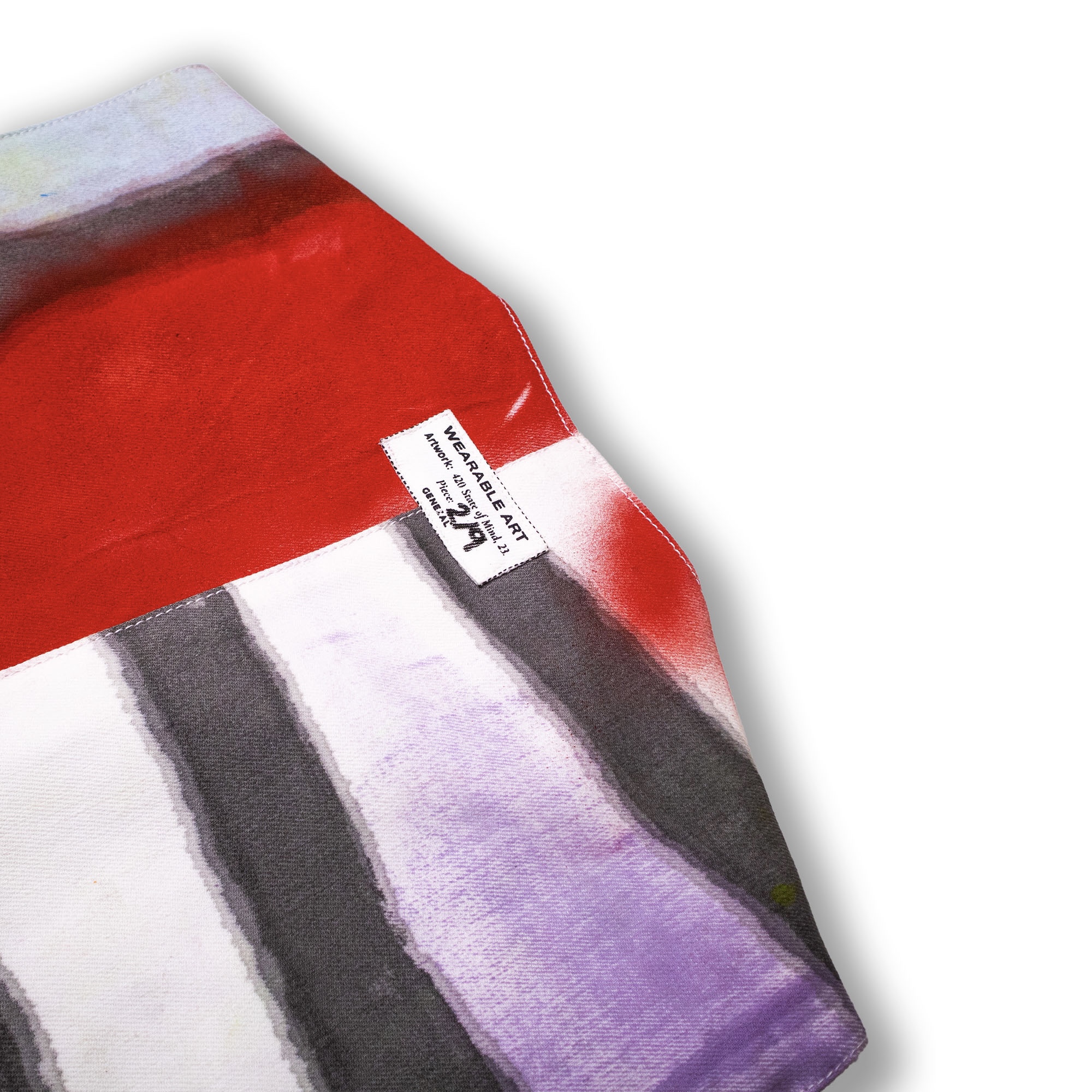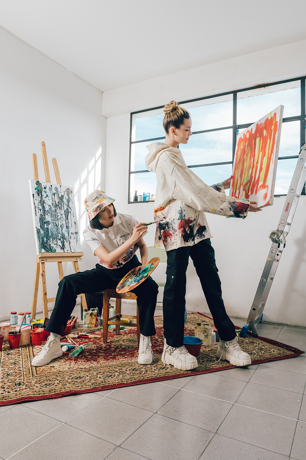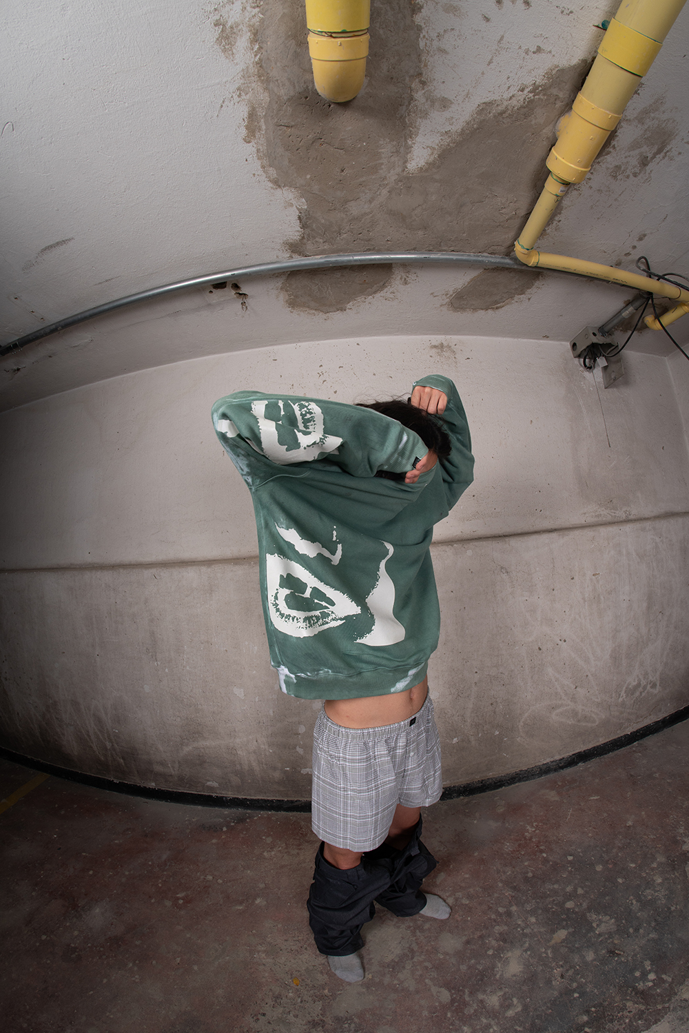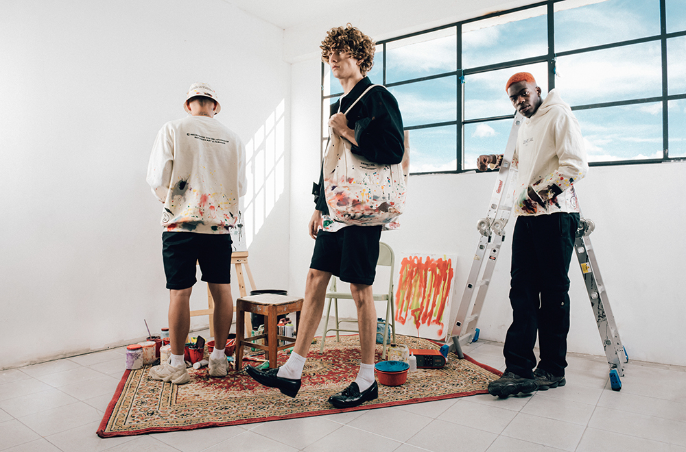 Nebulosa created a series of pieces including two-tone t-shirts, sweaters painted and later screen printed, bucket hats, and pants. A visceral collection charged with energy and honesty.