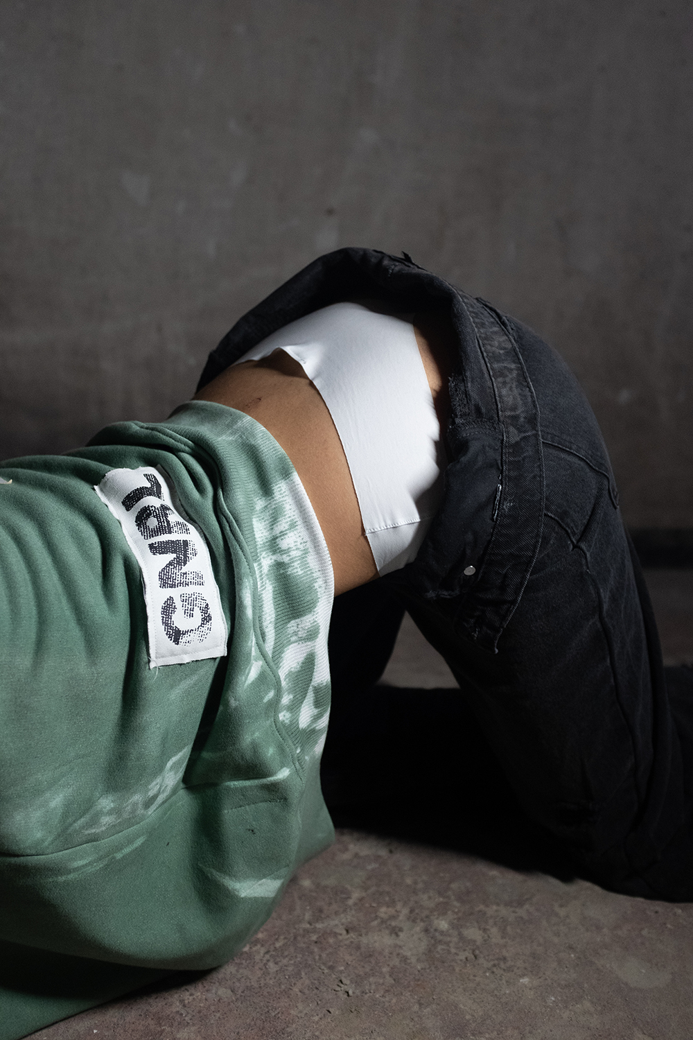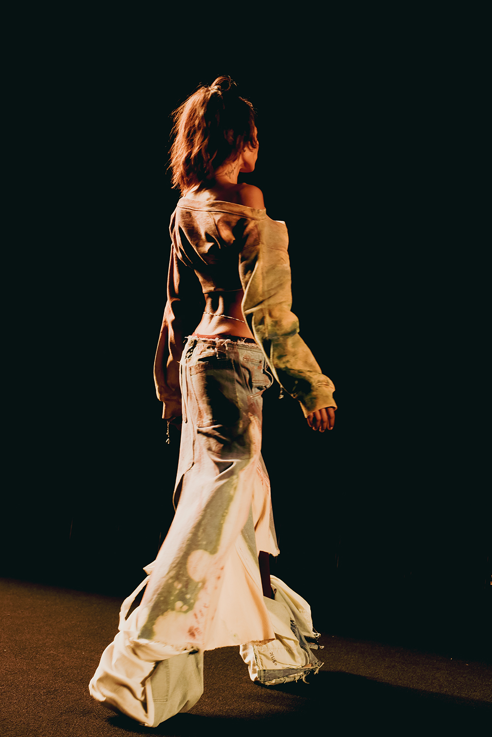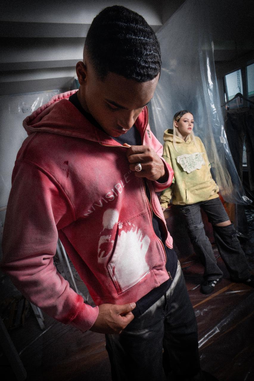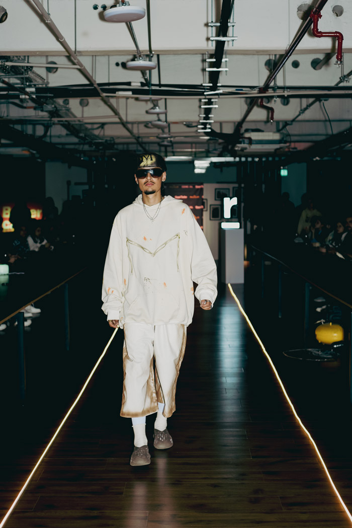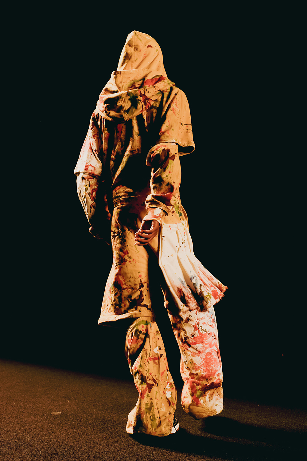 Exaggerated color fading, drill patchwork, and expressive paintwork formed the foundation of this proposal. Hoodies and pants with detachable parts, thanks to strategically placed zippers, brought a sense of adaptability and playfulness to the pieces.