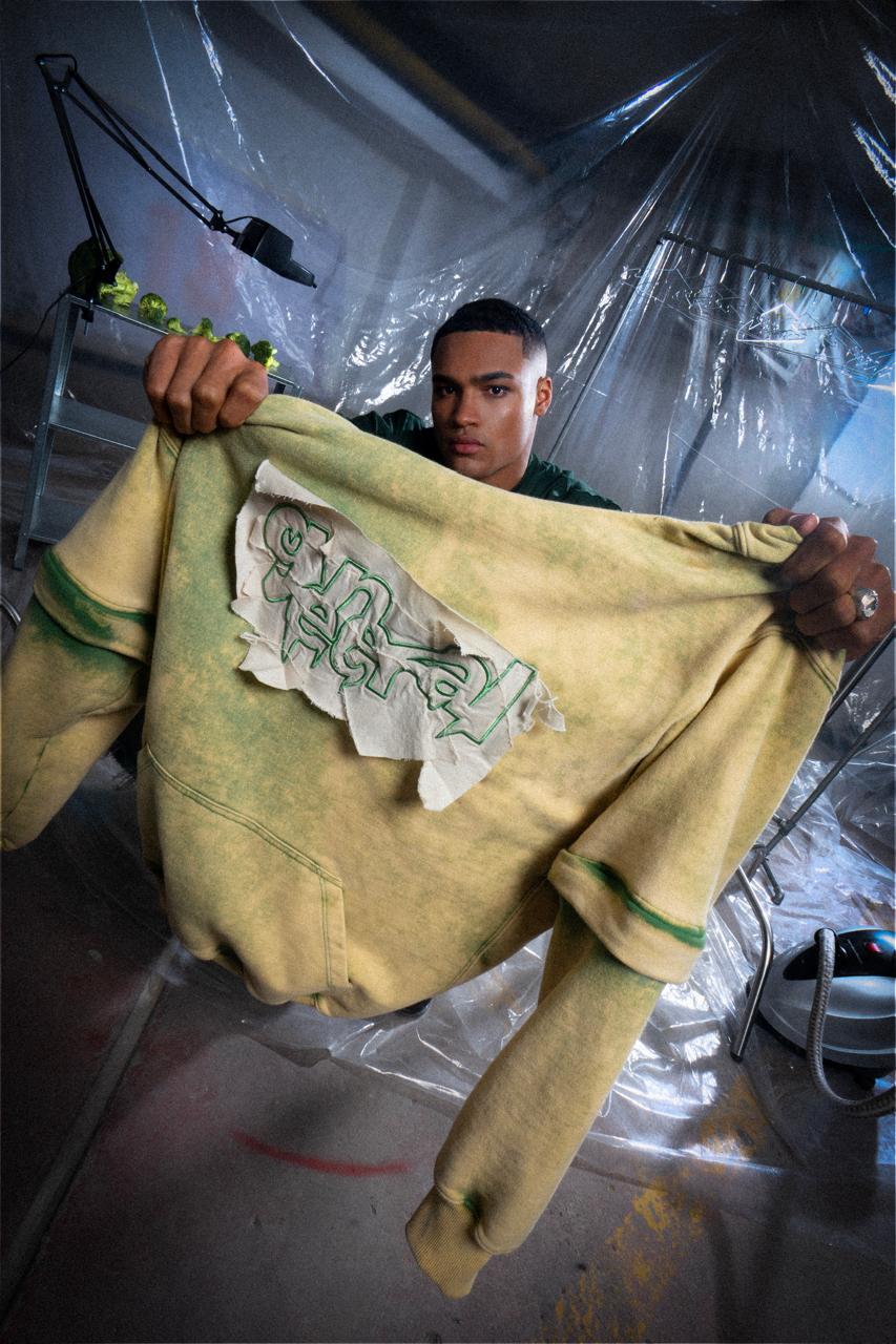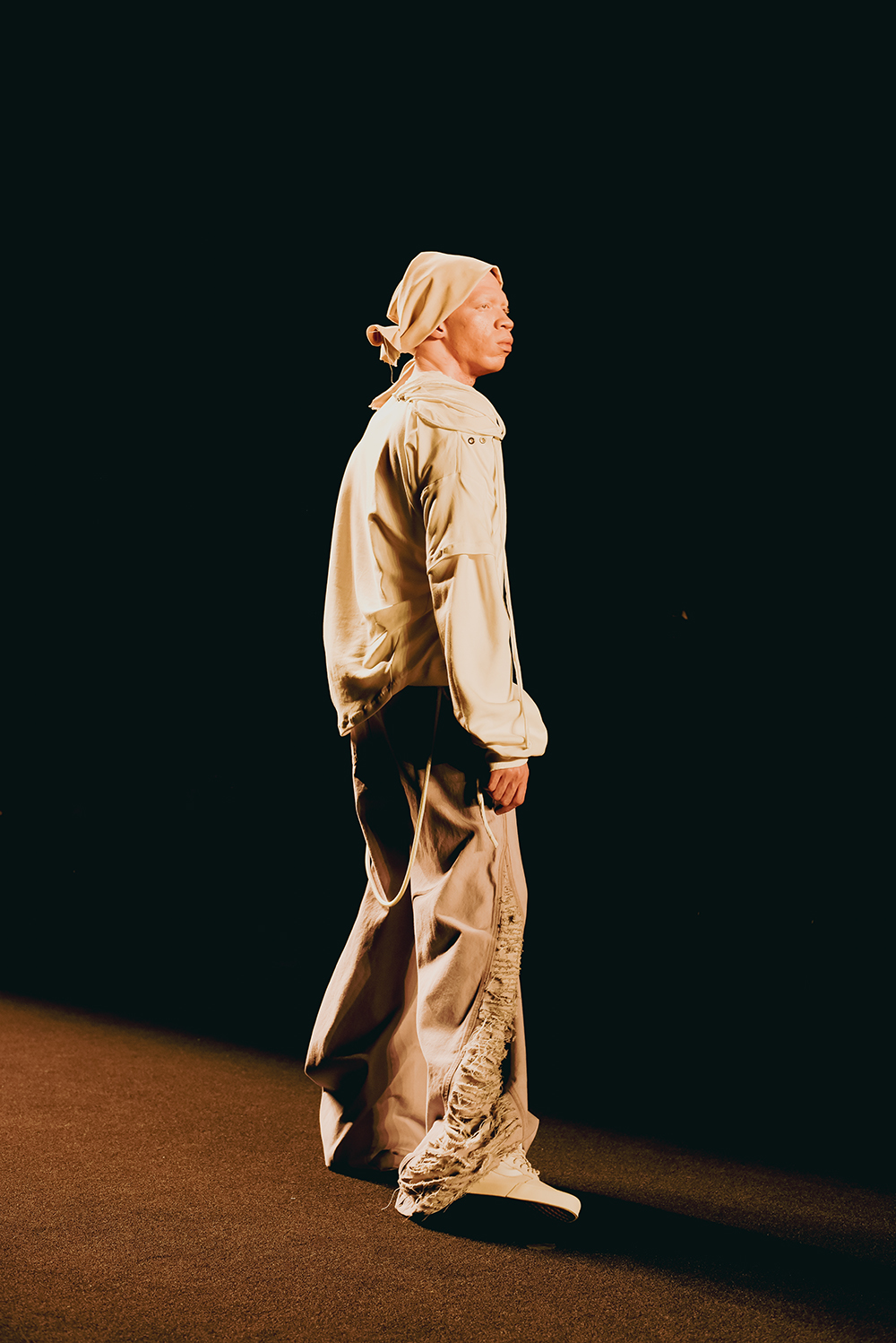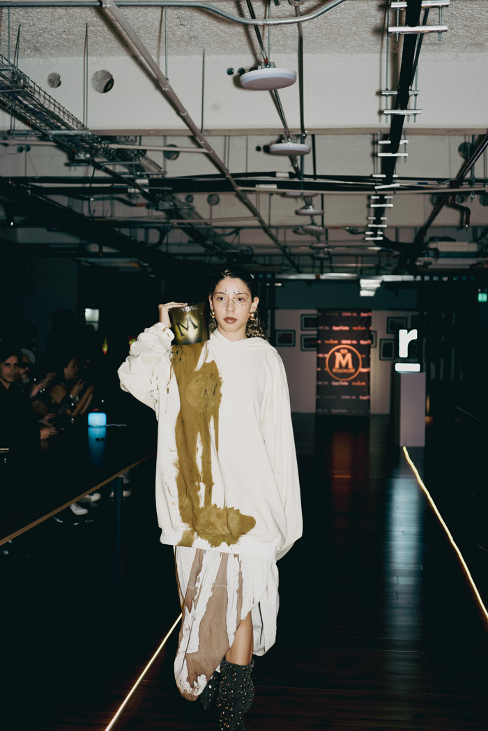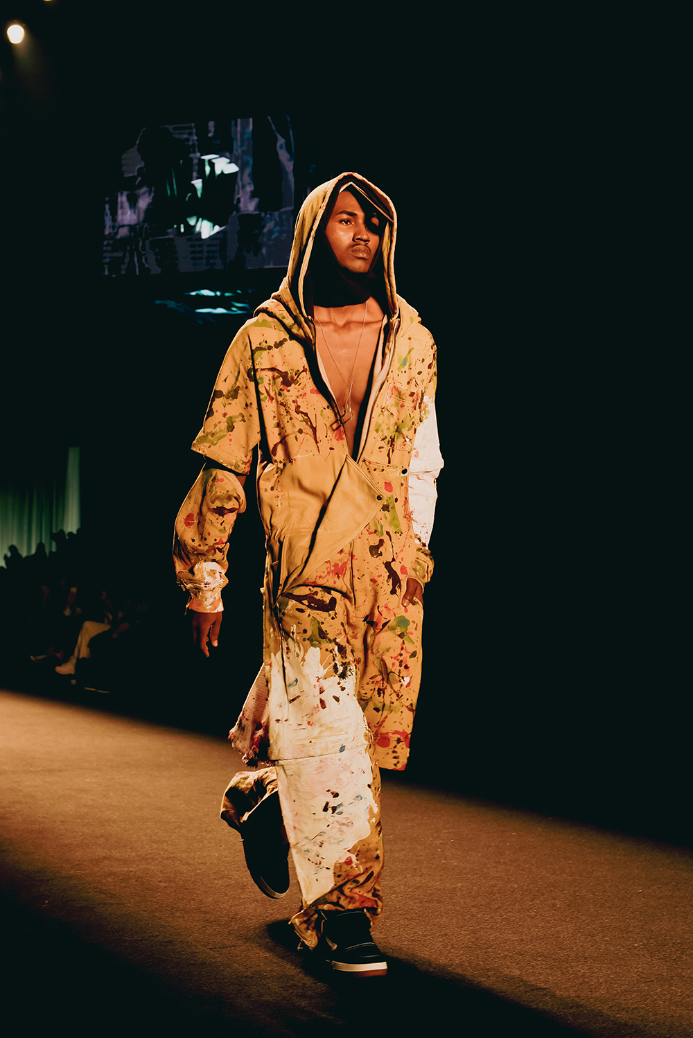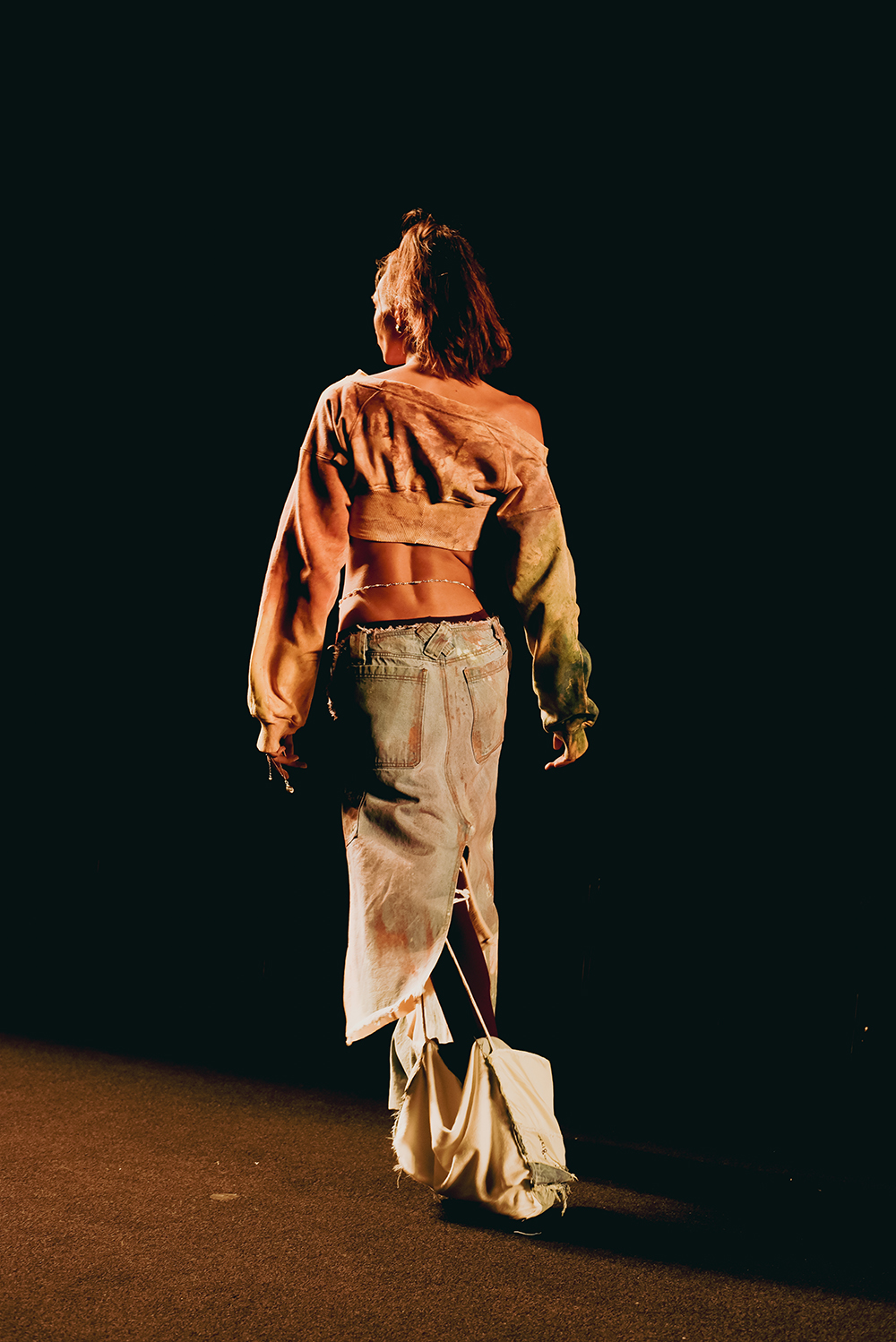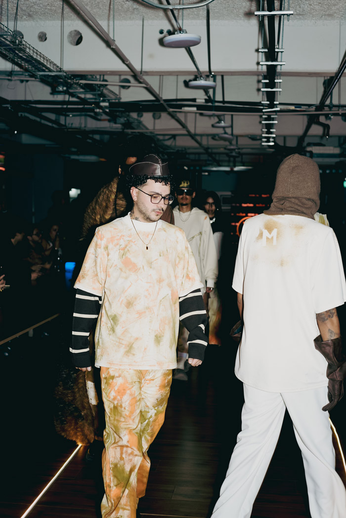 Exaggerated color fading, drill patchwork, and expressive paintwork formed the foundation of this proposal. Hoodies and pants with detachable parts, thanks to strategically placed zippers, brought a sense of adaptability and playfulness to the pieces.