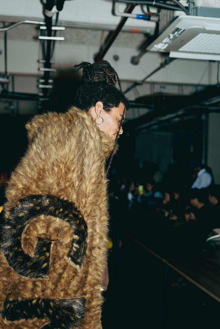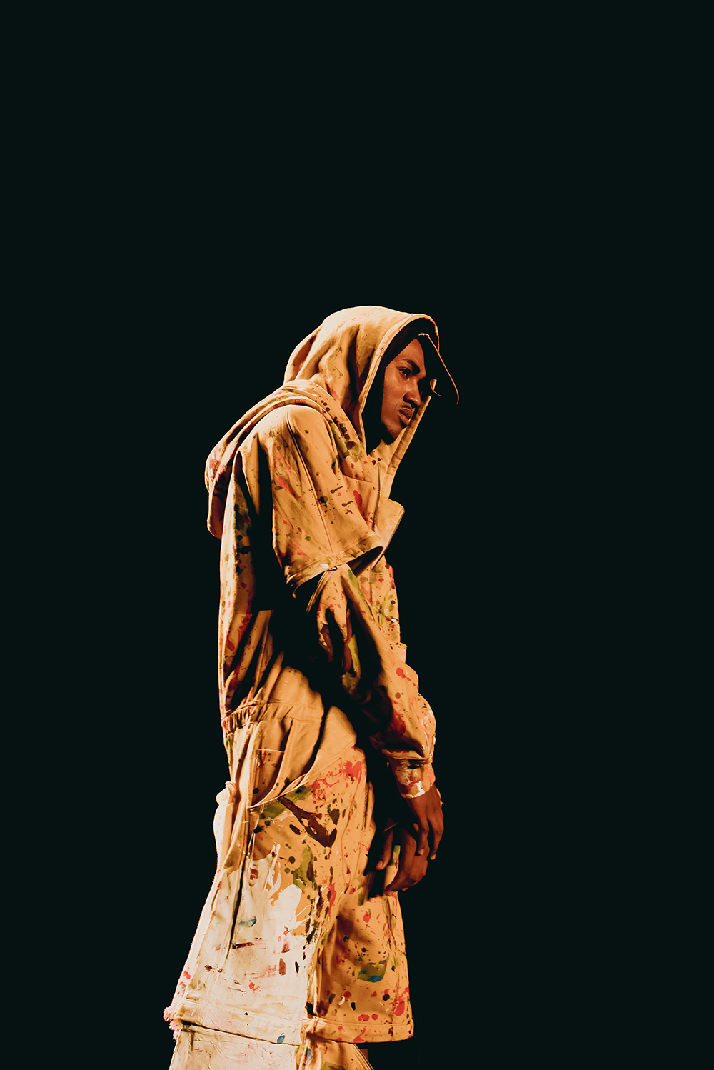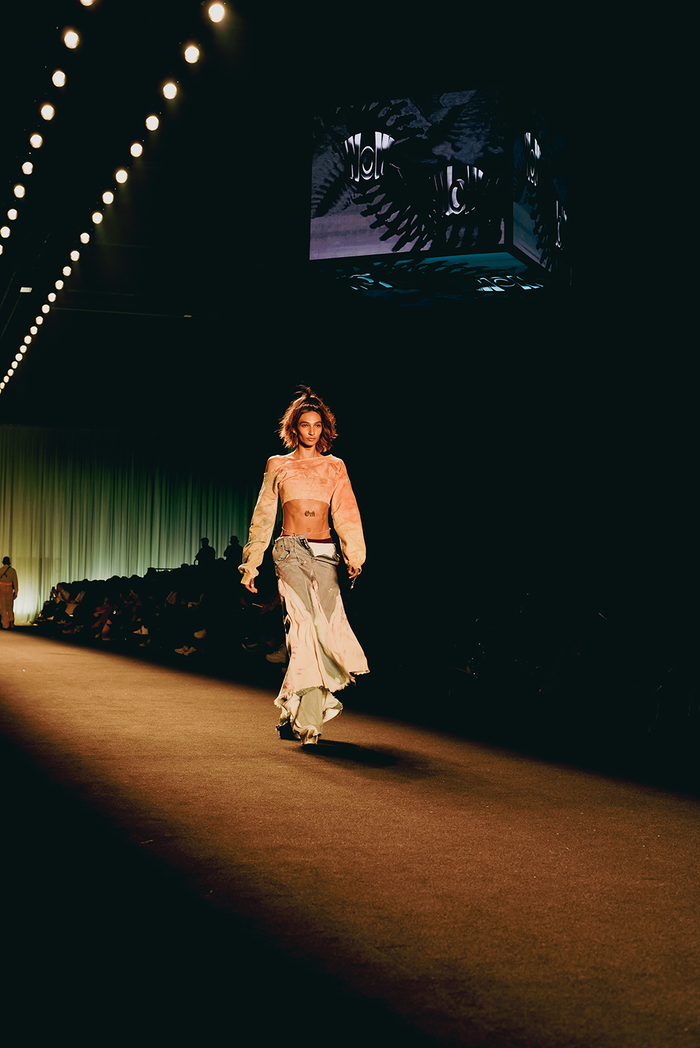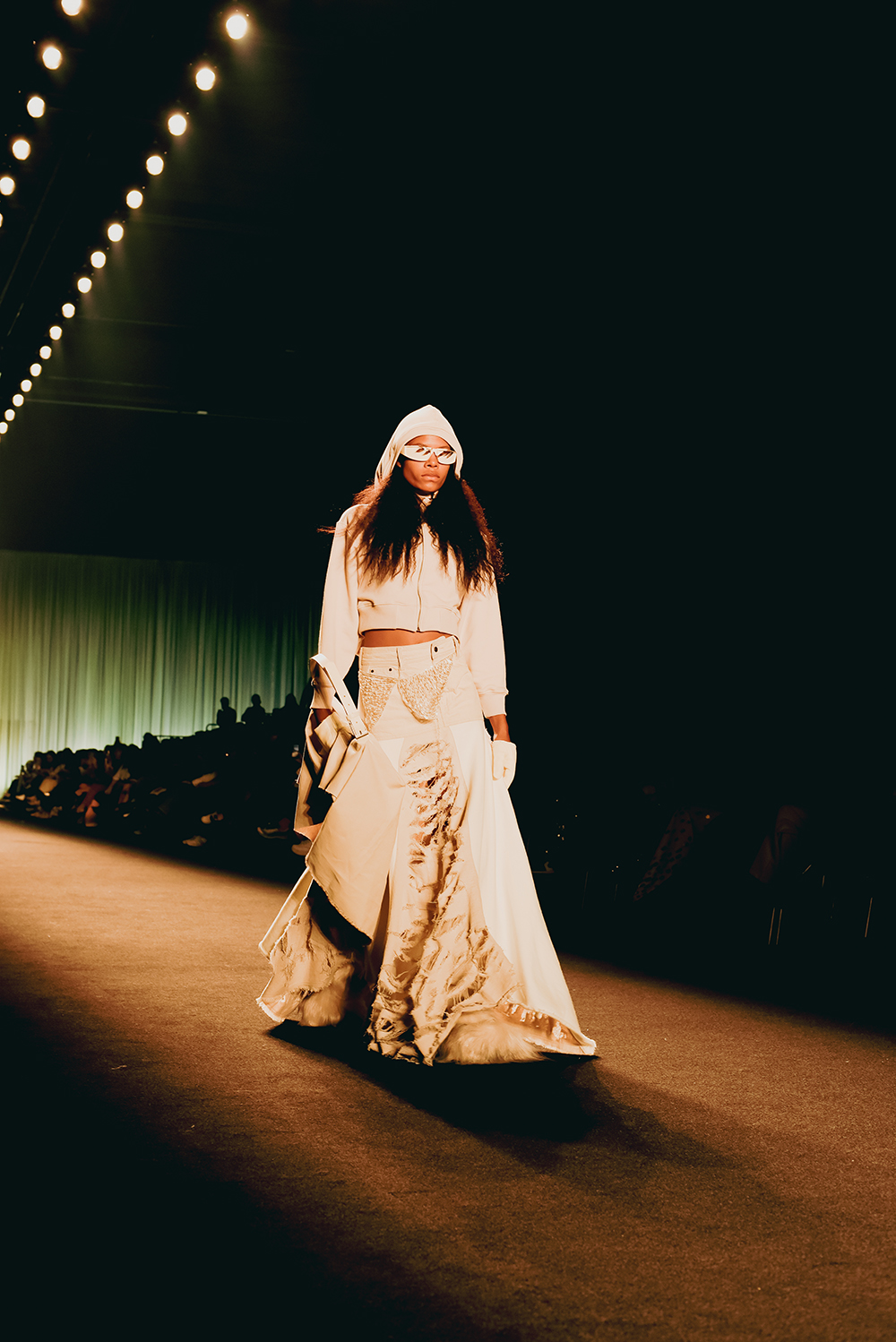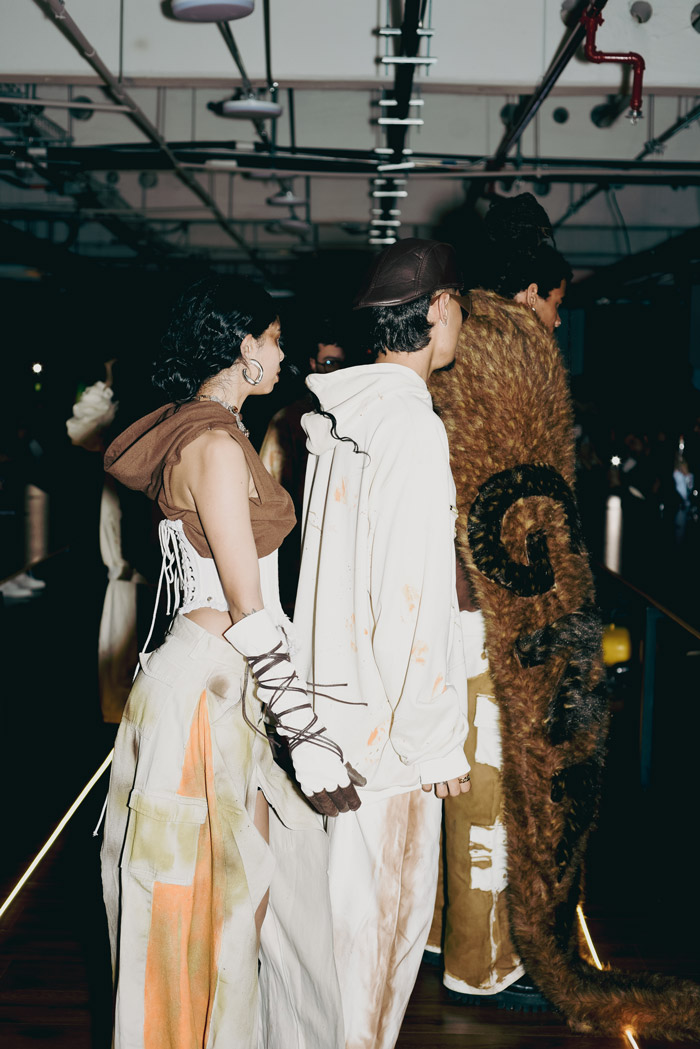 Exaggerated color fading, drill patchwork, and expressive paintwork formed the foundation of this proposal. Hoodies and pants with detachable parts, thanks to strategically placed zippers, brought a sense of adaptability and playfulness to the pieces.