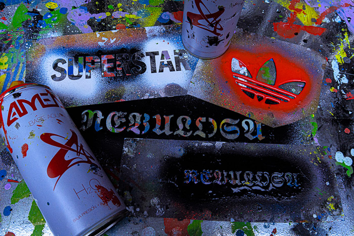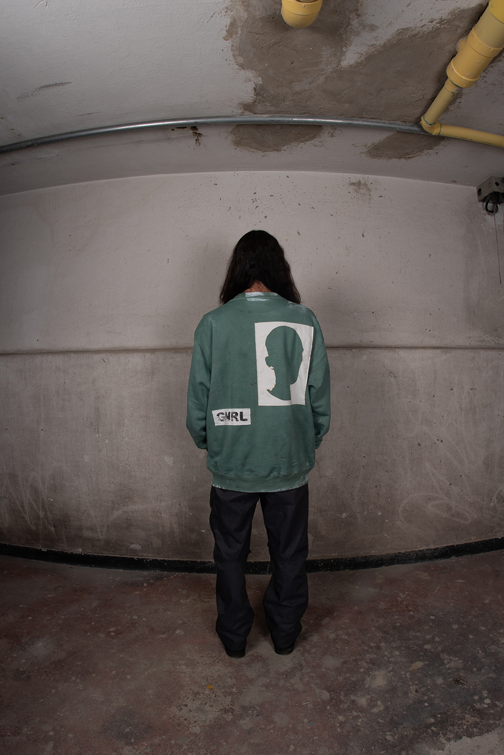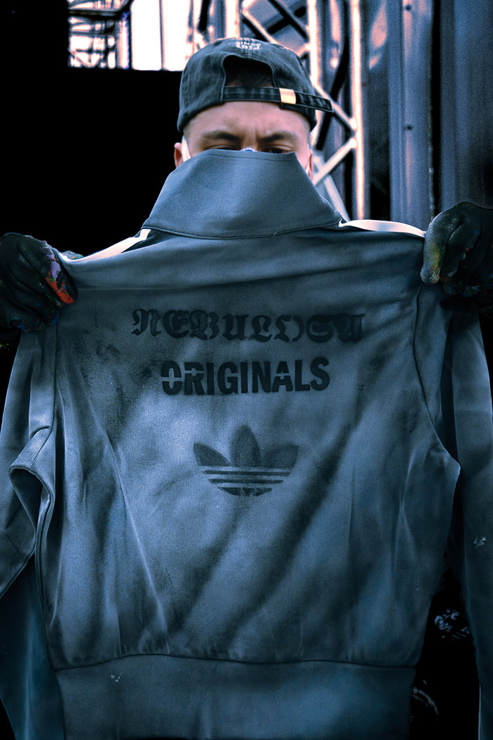 Nebulosa creó una serie de piezas que incluyen camisetas bicolor, sweaters intervenidos con pintura y luego estampados en serigrafía, bucket hats y pantalones. Una colección visceral, cargada de energía y honestidad.