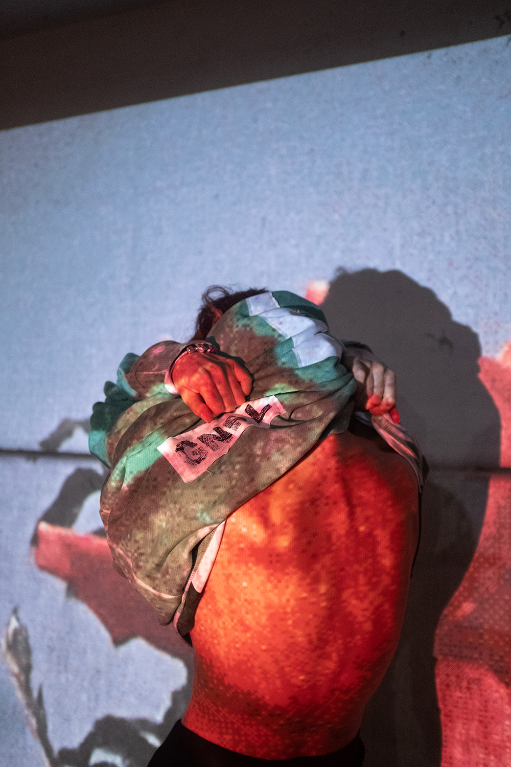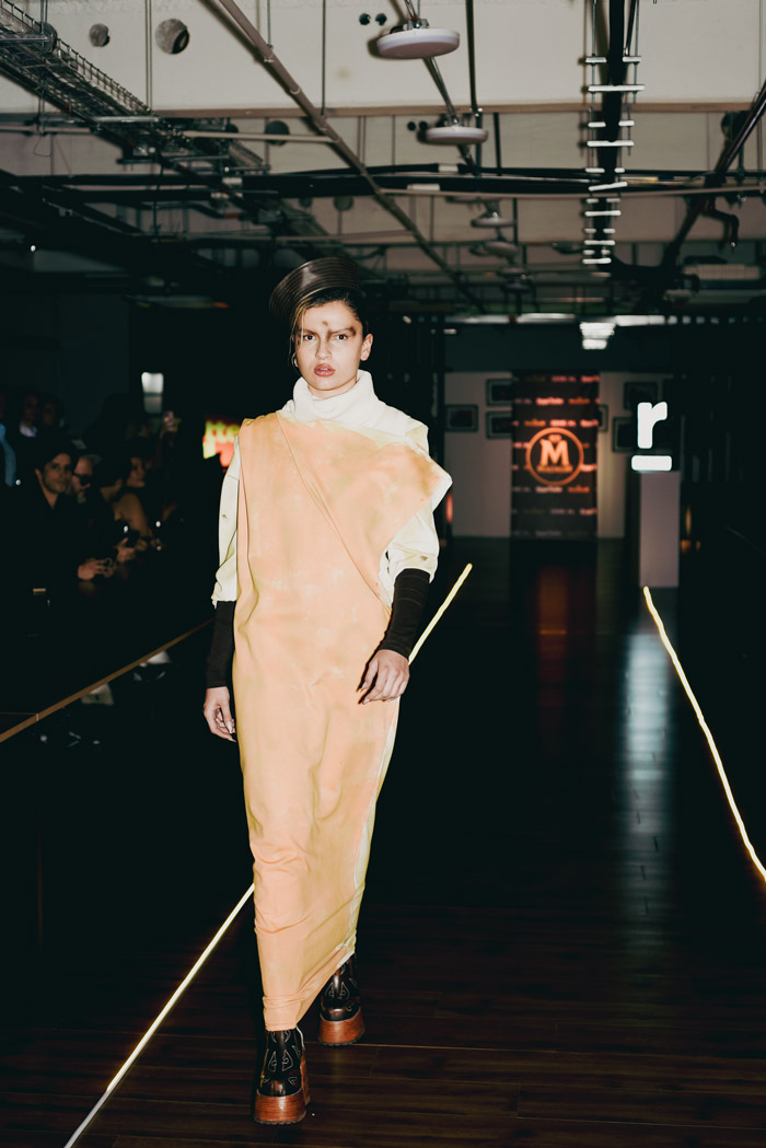 Para uno de los atuendos más emblemáticos, Nebulosa, como director creativo de GENErAL en ese entonces, colaboró con Vans en la creación de uno de los looks de cierre: el MAXI VESTIDO —una pieza compuesta por ocho capas de tela, rotas e intervenidas, que dejaban ver todo lo que cada capa contenía.