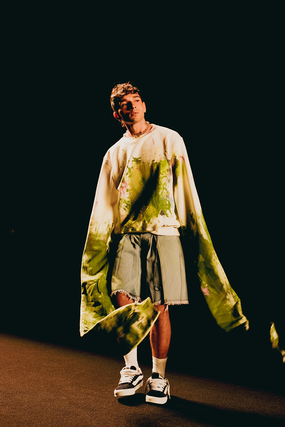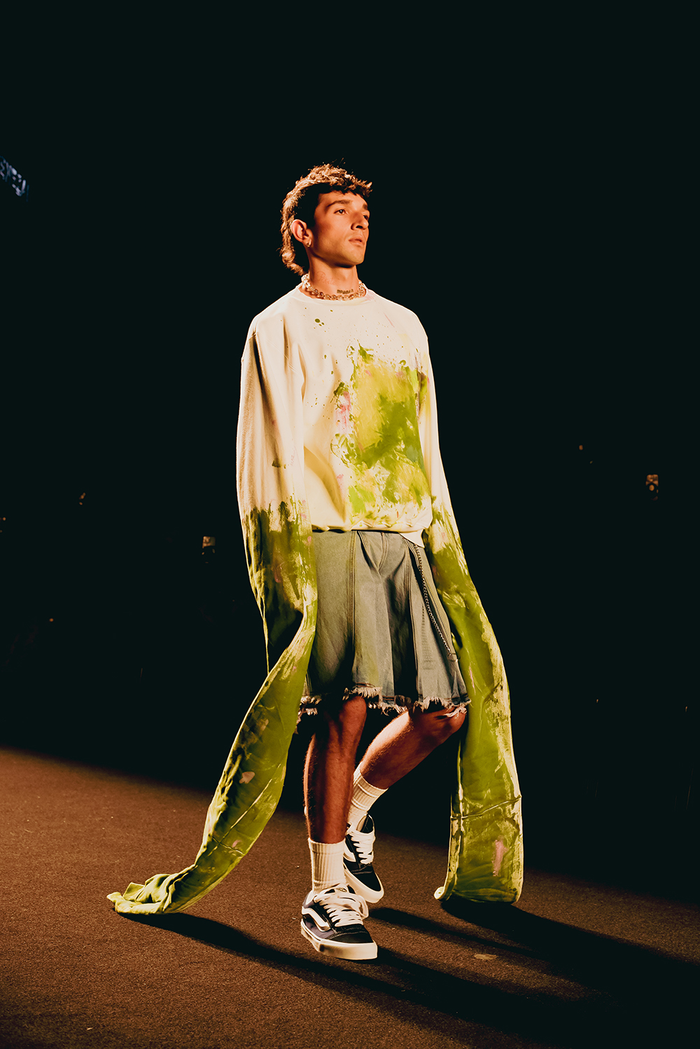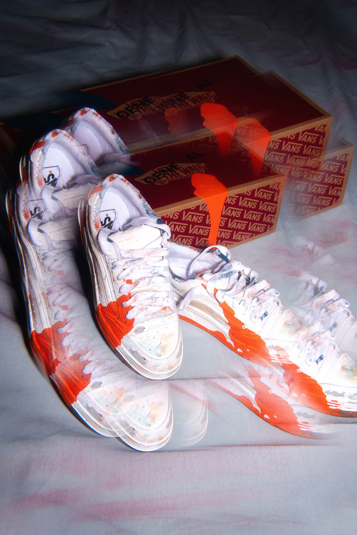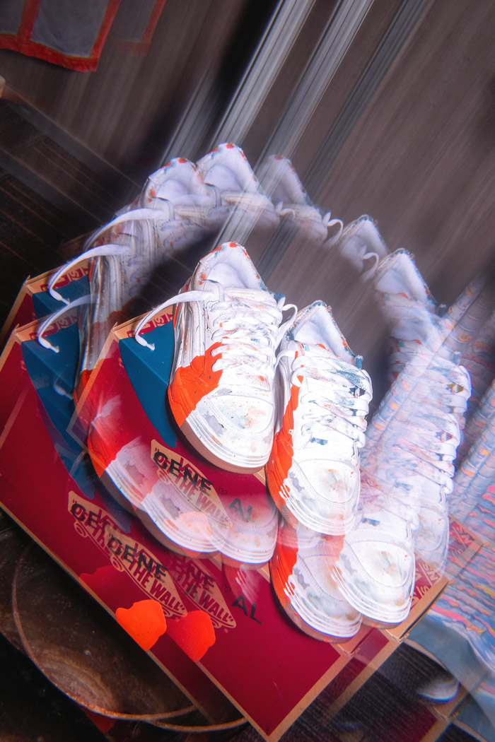 A partir de técnicas como el desgaste, la pintura y los cortes manuales, también se diseñó un par de Vans 1/1, usados por el modelo en la pasarela de clausura del Bogotá Fashion Week, en su sección streetwear.