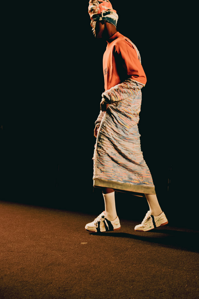 For one of its most emblematic looks, Nebulosa, then creative director of GENErAL, collaborated with Vans to create a show-stopping piece: the MAXI DRESS — a garment made from eight layers of fabric, torn and intervened, revealing everything hidden in each layer.