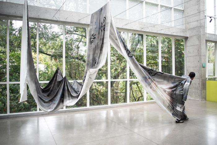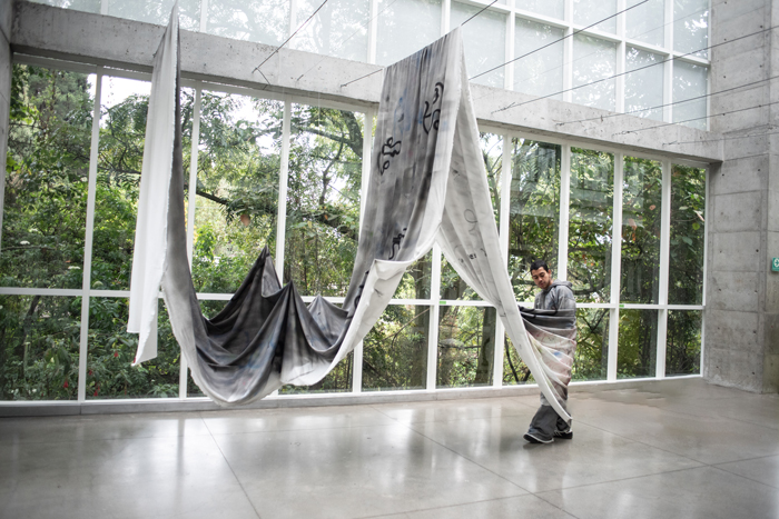 La obra opera como instalación y como prenda de vestir. Tres metros se convierten en un atuendo llevado por un modelo que pone en cuerpo la tela. El resto queda suspendido: pendiendo de guayas, con hilos torcidos que se funden con la materia, flotando entre líneas tensadas.