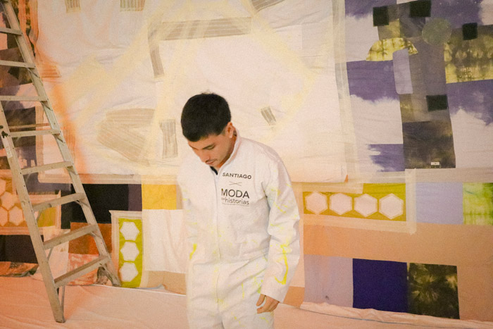 In Peonía, Nebulosa unfolds a single territory: 16 meters of fabric that begin in white, become saturated with pigment, and eventually transform into a garment—as if energy were flowing through every part of the textile. The fabric is painted, transformed, exposed, and activated.