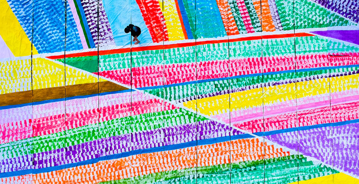 Bajo el sol ardiente del desierto, Nebulosa pintó una obra de 100 metros cuadrados sobre textil de fibra natural. El objetivo: traducir lo que sus ojos ven y su cuerpo percibe. Los colores. Las texturas. Los naranjas. Los azules. Los amarillos. La vibración de ese lugar.