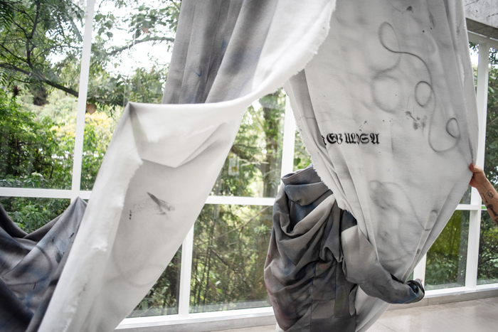 En Peonía, Nebulosa despliega un solo territorio: 16 metros de tela que comienzan en blanco, se cargan de pigmento y se convierten en un atuendo, como si la energía fluyera entre cada parte del textil. La tela se pinta, se transforma, se expone, se activa.