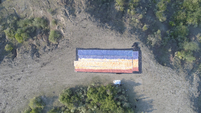 La escala de la obra exige la presencia del cuerpo. No puede ser observada desde un solo punto ni abordada de manera frontal: se camina y se recorre. En una de las imágenes, Nebulosa aparece dentro del campo, utilizando el cuerpo como unidad de medida frente a un textil que, por su dimensión, se comporta más como un territorio que como una superficie.