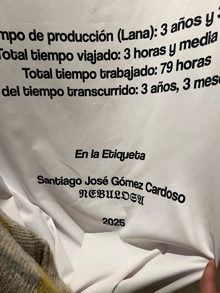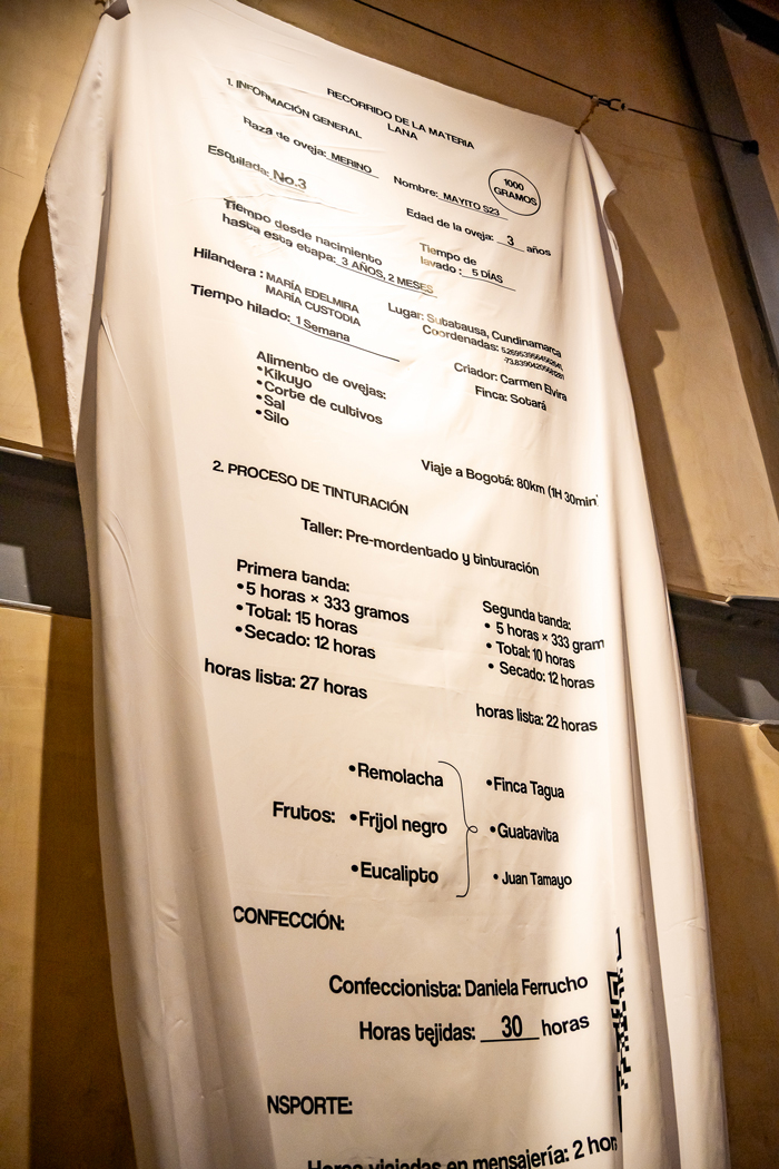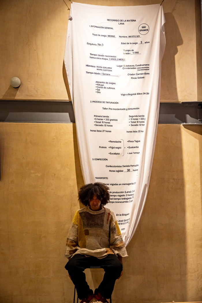 The work questions the opacity of the fashion system and proposes a different logic: one in which the journey matters as much as the result. The label details everything: from the raw material—wool from a specific sheep in the region of Sutatausa, Cundinamarca, in the mountains of Colombia—to the shearing, the hand spinning, the natural dyeing (with black bean, eucalyptus, and arracacha), and finally, the making of the garment. Everything is there: the hands, the distances, the time.